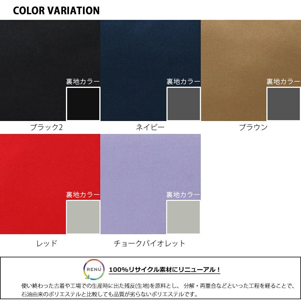 チャムス リサイクル アクセサリーズに使用されている生地「RENU」は、使い終わった古着や工場での生産時に出た残反(生地)を原料とし、 分解・再重合などといった工程を経ることで、石油由来のポリエステルと比較しても品質が劣らないポリエステルです。