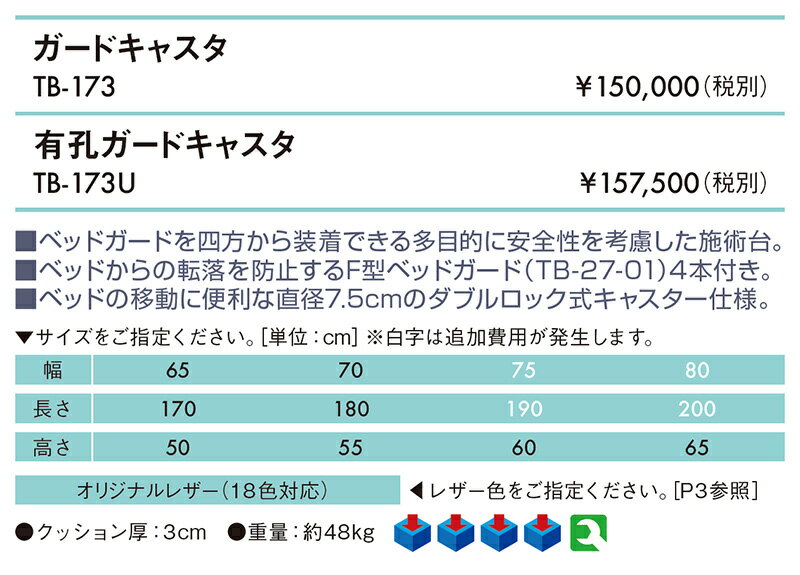 TB-173 無孔ガードキャスタ ベッドガードを四方から装着できる多目的に安全性を考慮した施術台。