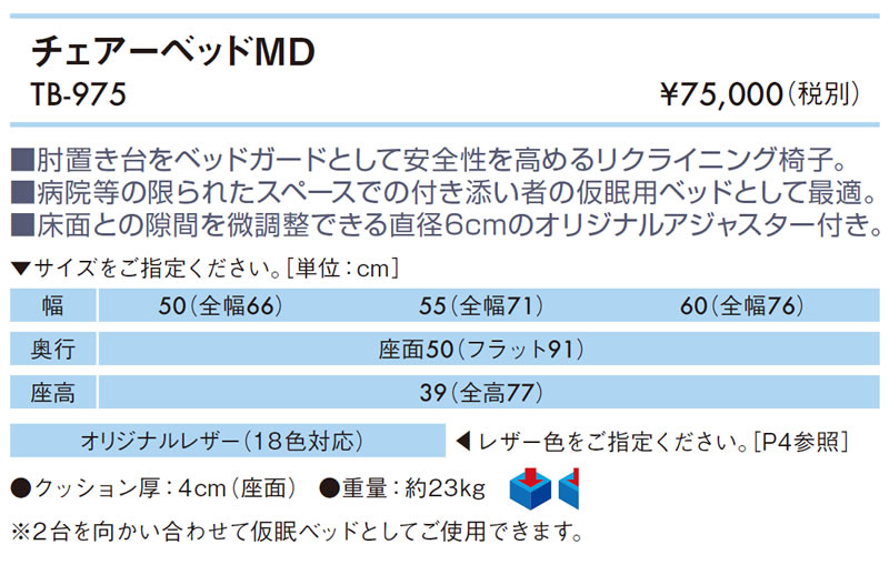 TB-975 チェアーベッドMD 肘置き台をベッドガードとして安全性を高めるリクライニング椅子。